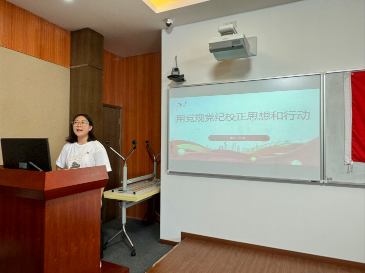 会议第一项议程是由孙小烨讲授《用党规党纪矫正思想和行动》专题党课,孙小烨首先强调了学习《中国共产党纪律处分条例》(以下简称《条例》)的重要性,纪律是管党治党的“戒尺”,也是党员、干部约束自身行为的标准和遵循。《条例》进一步严明了党的政治纪律和政治规矩,带动各项纪律全面从严。我们要切实把思想和行动统一到党中央决策部署上来,把开展党纪学习教育作为重要政治任务,用党规党纪校正思想和行动,真正使学习党纪的过程成为增强纪律意识、提高党性修养的过程。孙小烨指出,党员们务必牢记六大纪律,作为同学中的领头羊要充分发挥党员的先进性、模范性,在平日里要多作为、敢作为,多参与支部活动,主动进行学习和交流,砥砺担当作为,履职尽责勇挑重任。