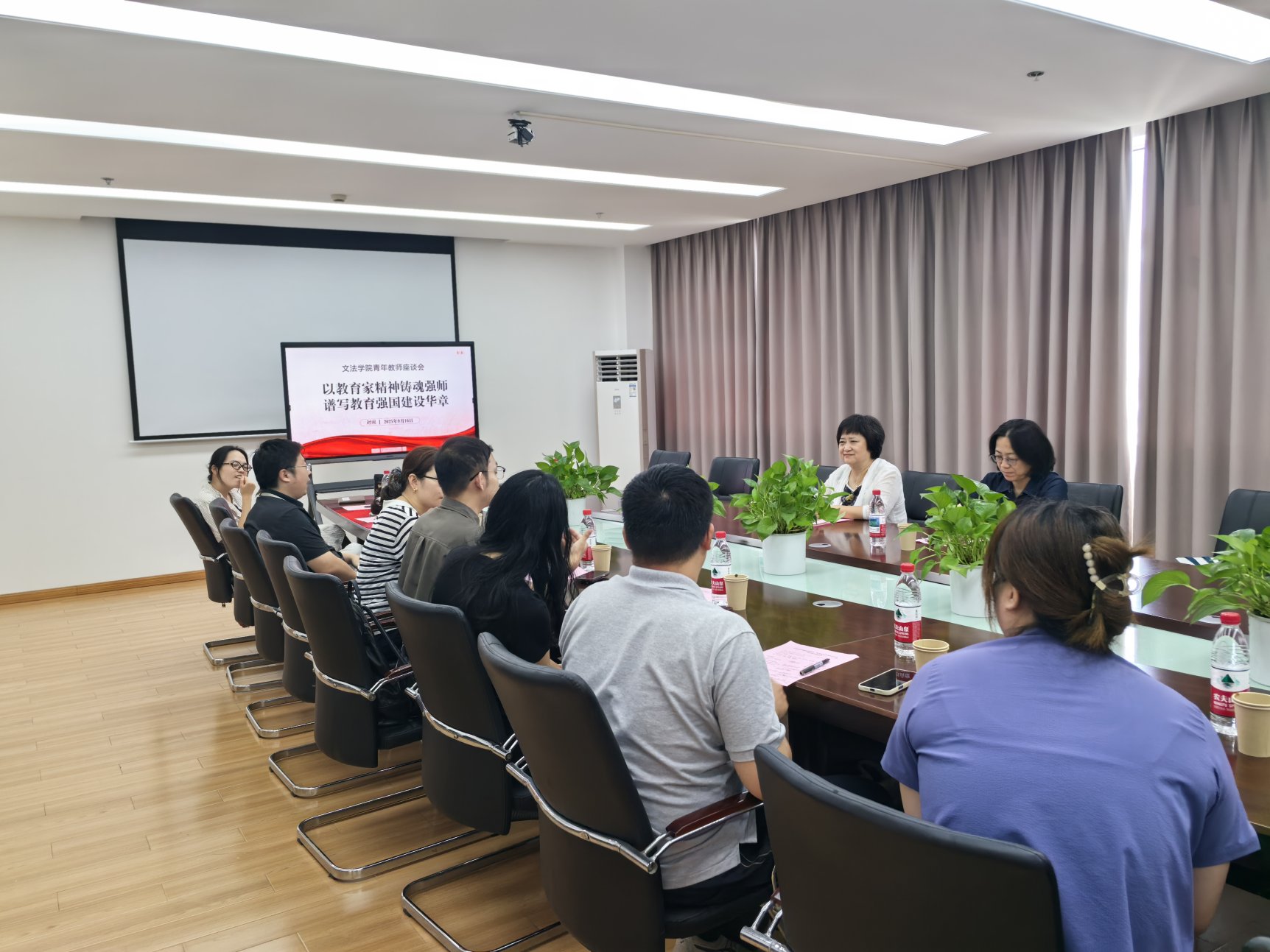 为庆祝第41个教师节,落实好学校“第四届师德师风建设月专项活动”相关要求,深化师德师风建设,促进本科教育教学审核评估等重点工作有序推进,9月16日下午,文法学院在中山西路校区1504会议室举行“以教育家精神铸魂强师 谱写教育强国建设华章”为主题的青年教师座谈会。本次会议由党总支书记朱永莉主持,院长卢宁、办公室主任李娜及十余位青年教师代表参加会议。