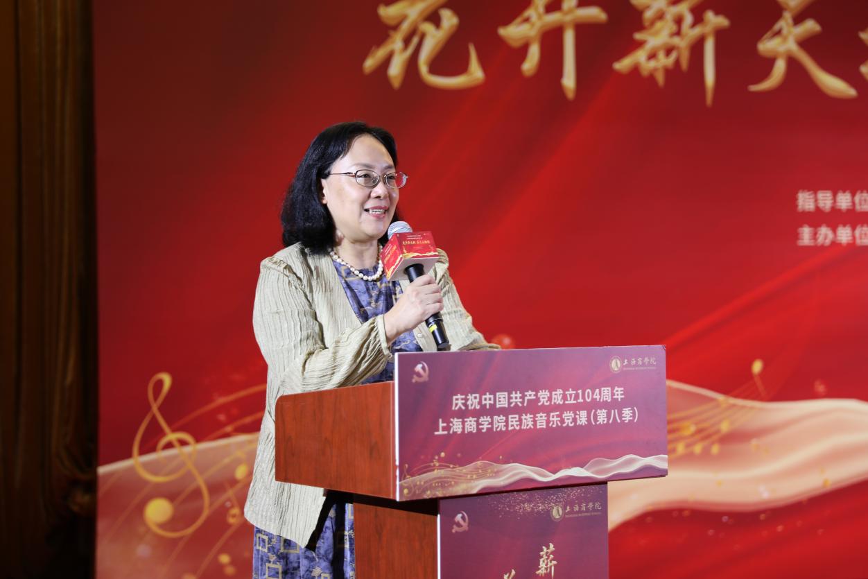 党委副书记、副校长劳晓芸为本次活动致辞,她表示,今年是上海商学院建校75周年,学校始终与党和国家的发展同频共振。她回顾了党的十八大以来,以习近平同志为核心的党中央带领中国人民取得的举世瞩目的成就,并强调上海商学院民族音乐党课作为学校特色党建品牌,自2021年起已连续开展七季,活动通过音乐与党课的深度融合,推动学校师生强化“四个意识”、坚定“四个自信”、践行“两个维护”,弘扬中华美育精神,落实以美育人、以美化人、以美培元的教育理念,激发师生爱国情怀,增强文化自信,推动美育教育水平不断提升。她还指出,按照上级部署要求,我校正深入开展贯彻中央八项规定精神学习教育,本次党课聚焦主题,贯通党性党风党纪教育,是推动学习教育走深走实的生动实践。