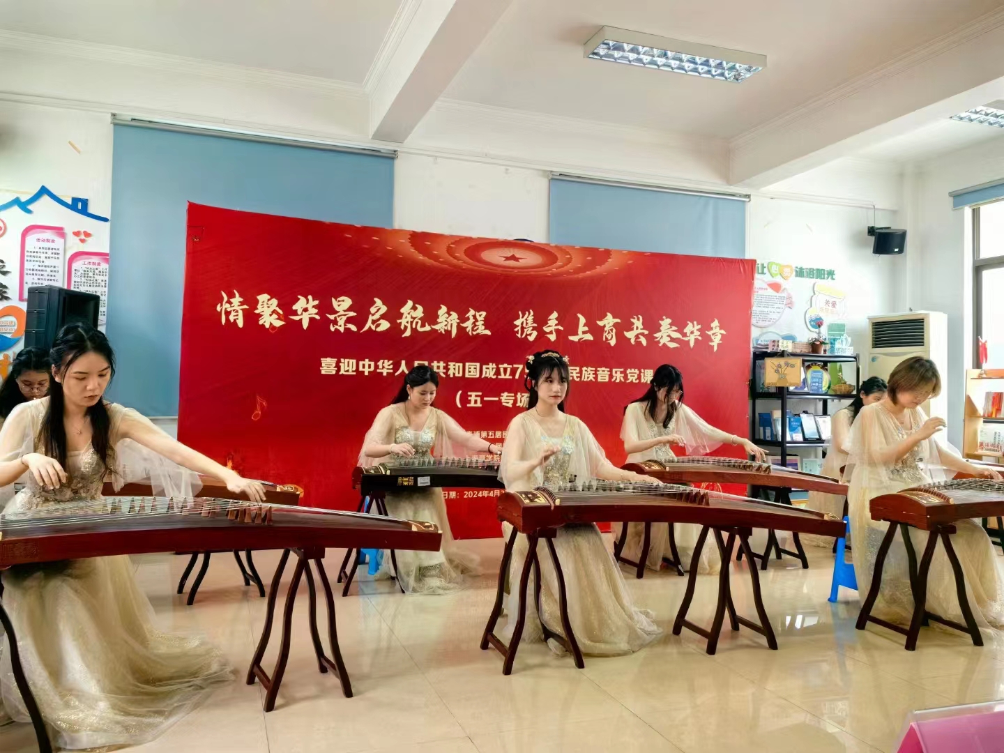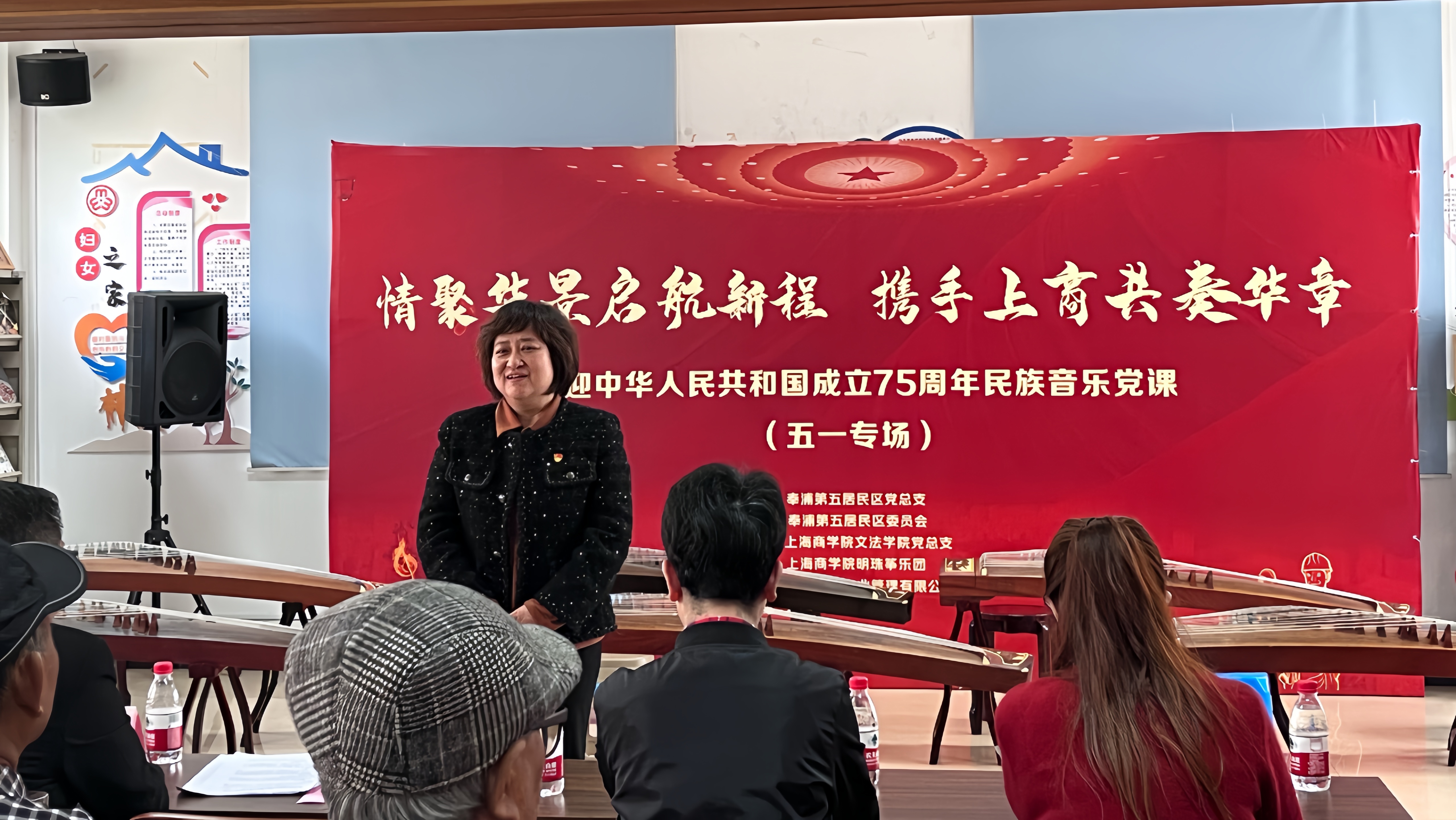 2021-2023,三年时间,上海商学院民族音乐党课连续四季成功开讲。为深入学习贯彻习近平新时代中国特色社会主义思想,上海商学院文法学院党总支始终坚持以音乐为媒介,以党课为平台,创新用好党课这个“传家宝”,在打造民族音乐党课为新生第一课的基础上,党总支探索实施将区域化党建与民族音乐党课相结合,探索民族音乐党课进社区、进乡村,以更好的发挥高校服务社会的职能。4月27日,以“情聚华景启航新程,携手上商共奏华章”为主题的喜迎中华人民共和国成立75周年民族音乐党课在奉浦第五居委圆满落幕。本次民族音乐党课由文法学院党总支、奉浦第五居民区党总支主办,由上海商学院明珠筝乐团承办。文法学院党总支书记朱永莉、奉浦五居委党总支书记徐丽苹、明星村党总支书记钟晨军、奉浦五居委党总支副书记王海、明珠筝乐团指导老师钟乐、文法党总支组织员杨凤美及50余位奉浦五居委党员、群众参加。