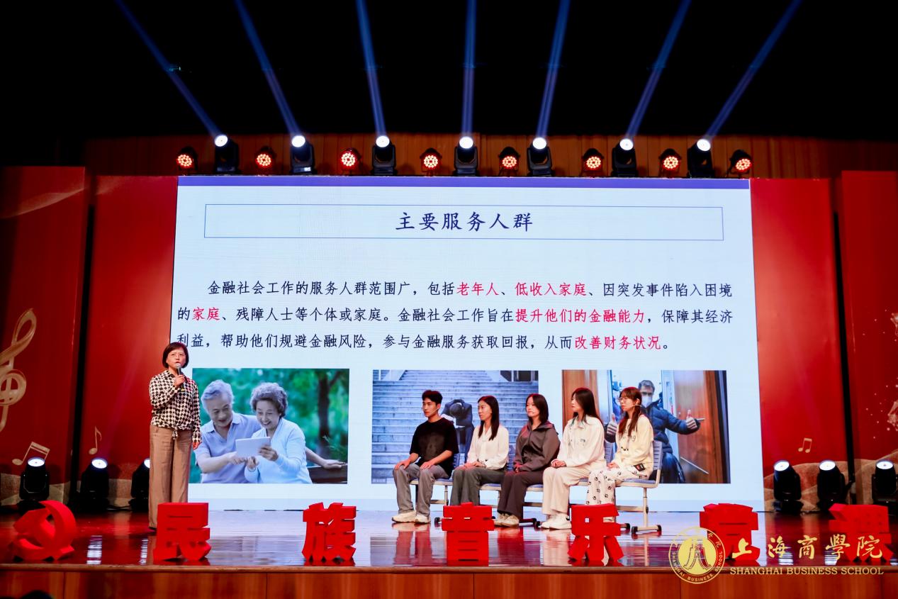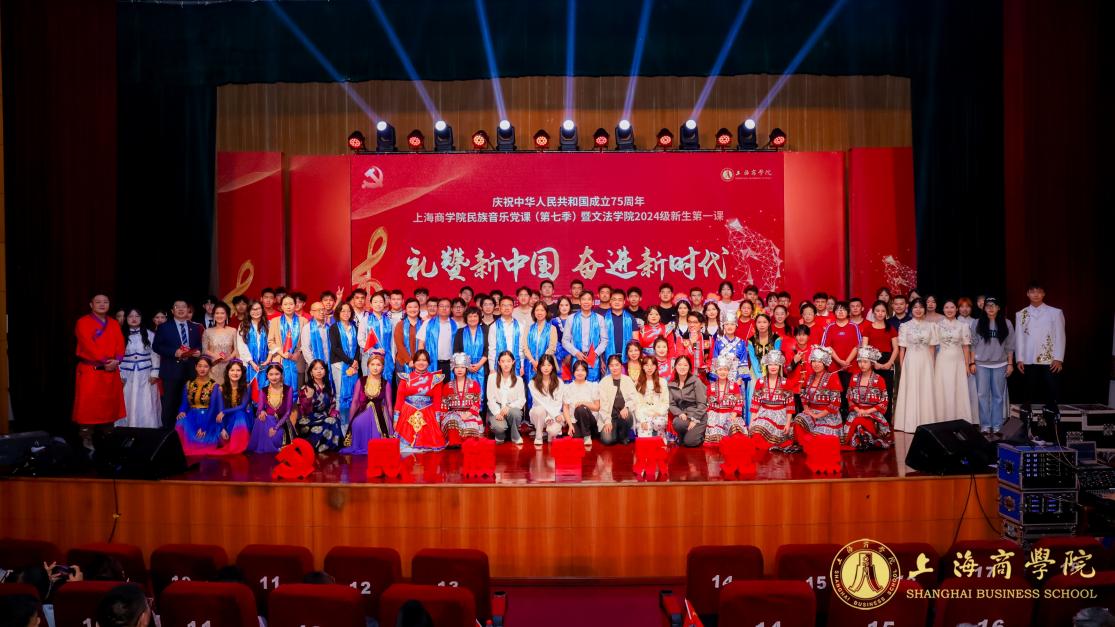 为庆祝中华人民共和国成立75周年,全面贯彻落实党的二十届三中全会精神,弘扬教育家精神,同时创新开好2024级新生第一课,10月15日下午,“礼赞新中国 奋进新时代”庆祝中华人民共和国成立75周年上海商学院民族音乐党课(第七季)暨文法学院2024级新生第一课在金汇镇泰日影剧院展演。党课由中共上海商学院委员会组织部、统战部指导、中共上海商学院委员会学生工作部、中共上海商学院文法学院总支部委员会、中共上海市奉贤区金汇镇明星村总支部委员会联合主办。上海商学院党委常委、党委组织部、统战部部长朱巍娟,上海奉贤区金汇镇党委副书记郭东海,明星村党总支书记钟晨军,上海商学院教务处副处长(主持工作)栾东庆,党委教师工作部副部长曹建涛,党委学工部副部长郁敏,校团委书记卜树俊、文法学院党总支书记朱永莉,院长方有林,副院长卢宁,副书记林丽娜及明星村党总支委员会、文法学院党总支委员、村民代表、文法学院支部书记、系主任、2024级新生等二百余人参加本次党课活动。
