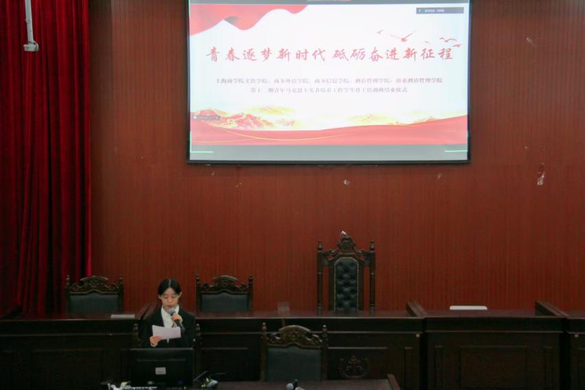 为深入学习习近平新时代中国特色社会主义思想,贯彻落实党的二十大和二十届三中全会精神,2024年12月10日下午,上海商学院文法学院、商务信息学院、商务外语学院、酒店管理学院、上海洛桑酒店管理学院,五院联合举办的第十八期团校暨第十二期“青马工程”活动在奉浦校区4号楼543模拟法庭顺利结营。本次活动由文法学院赵菱华主持,教师代表文法学院团委书记董健鹏、酒店管理学院团委书记张泾泾,以及全体青马学员出席会议。