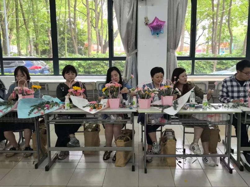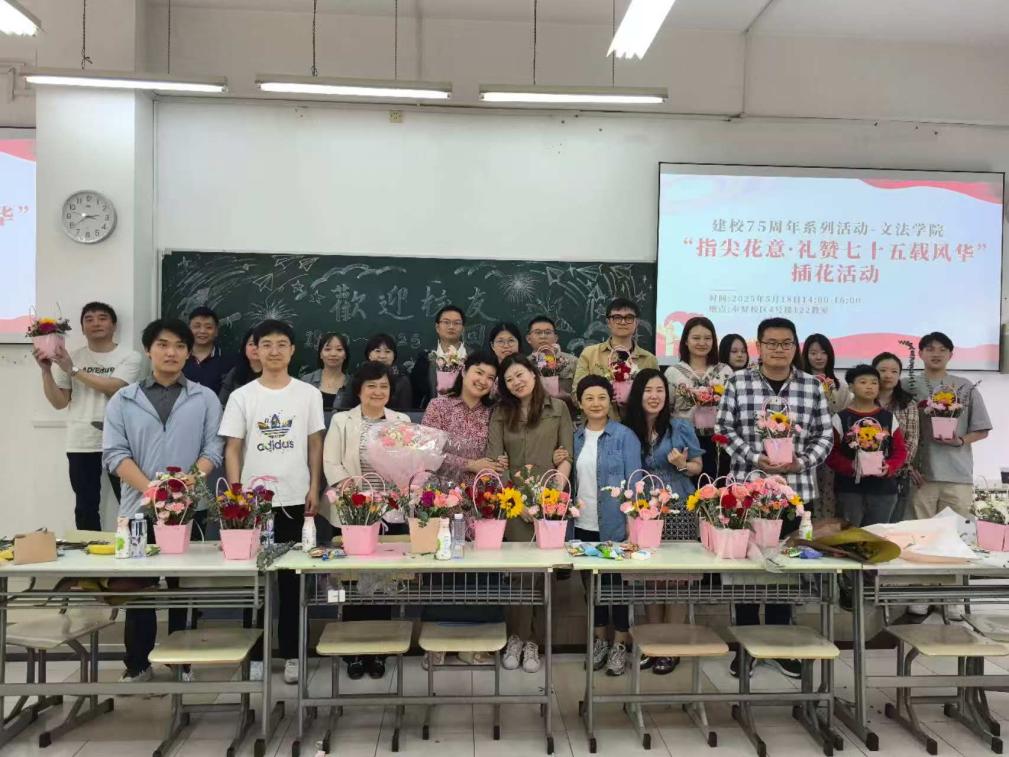 接着,进行了“指尖花意・礼赞七十五载风华”插花活动。学院特邀专业花艺师现场教学,校友与师生们围坐一堂,在花艺师的指导下,精心挑选花枝、修剪枝叶、搭配造型。现场欢声笑语不断,大家沉浸在创作的乐趣中,将对学院的美好祝福融入到一件件精美的插花作品中。一枝一叶,皆是对学校七十五载风华的礼赞;一花一篮,都承载着师生校友们对学校未来的美好憧憬。现场其乐融融的氛围,不仅增进了彼此间的情谊,更展现出文法学院团结向上、朝气蓬勃的精神风貌。