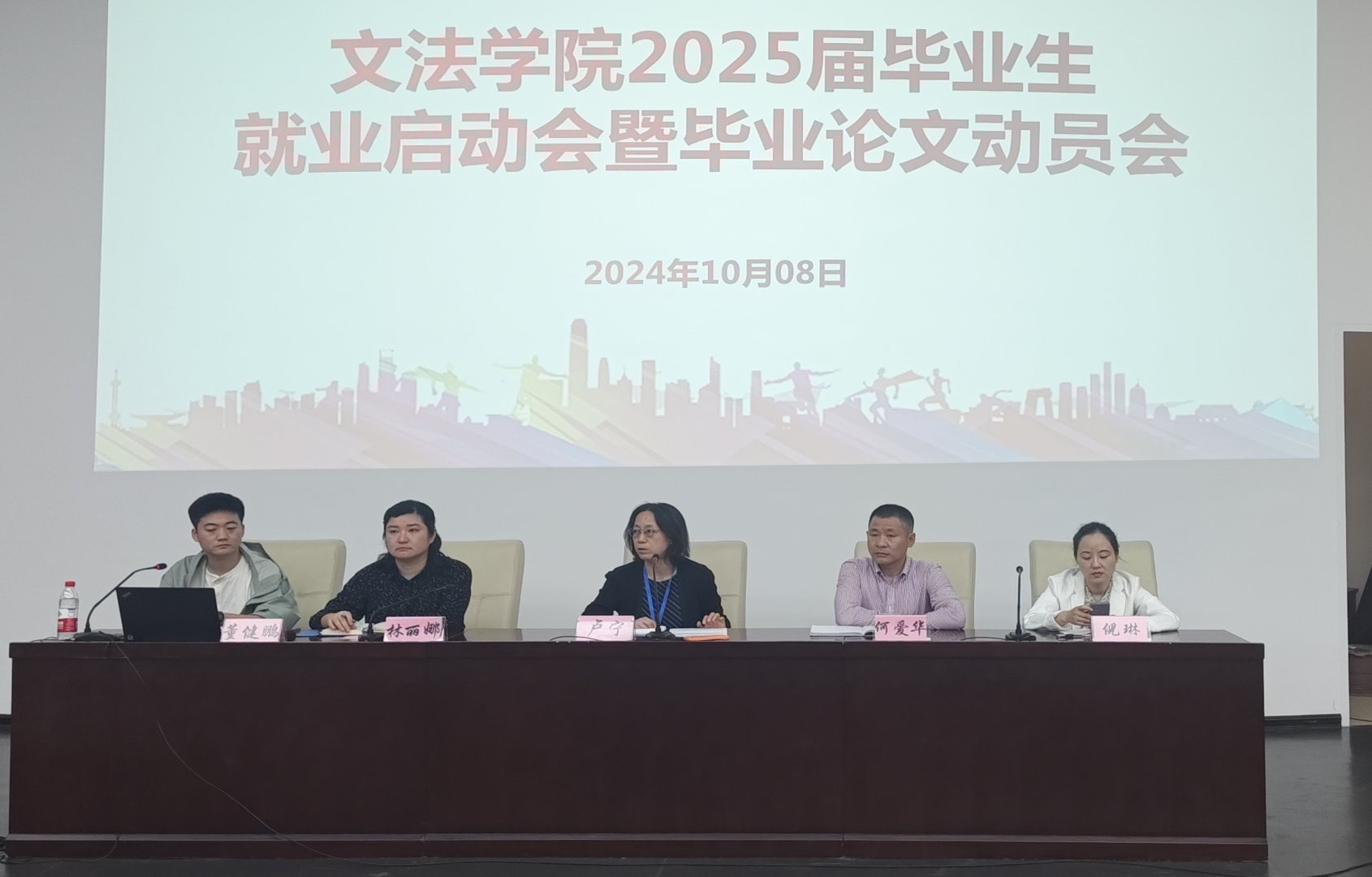 2024年10月8日,文法学院在中山西路校区3楼报告厅组织召开2025届毕业生就业启动会暨毕业论文动员会。常务副院长卢宁,党总支副书记、副院长林丽娜,法学系系主任何爱华,广告学系系主任倪琳,2021级辅导员董健鹏出席会议。会议由林丽娜老师主持。