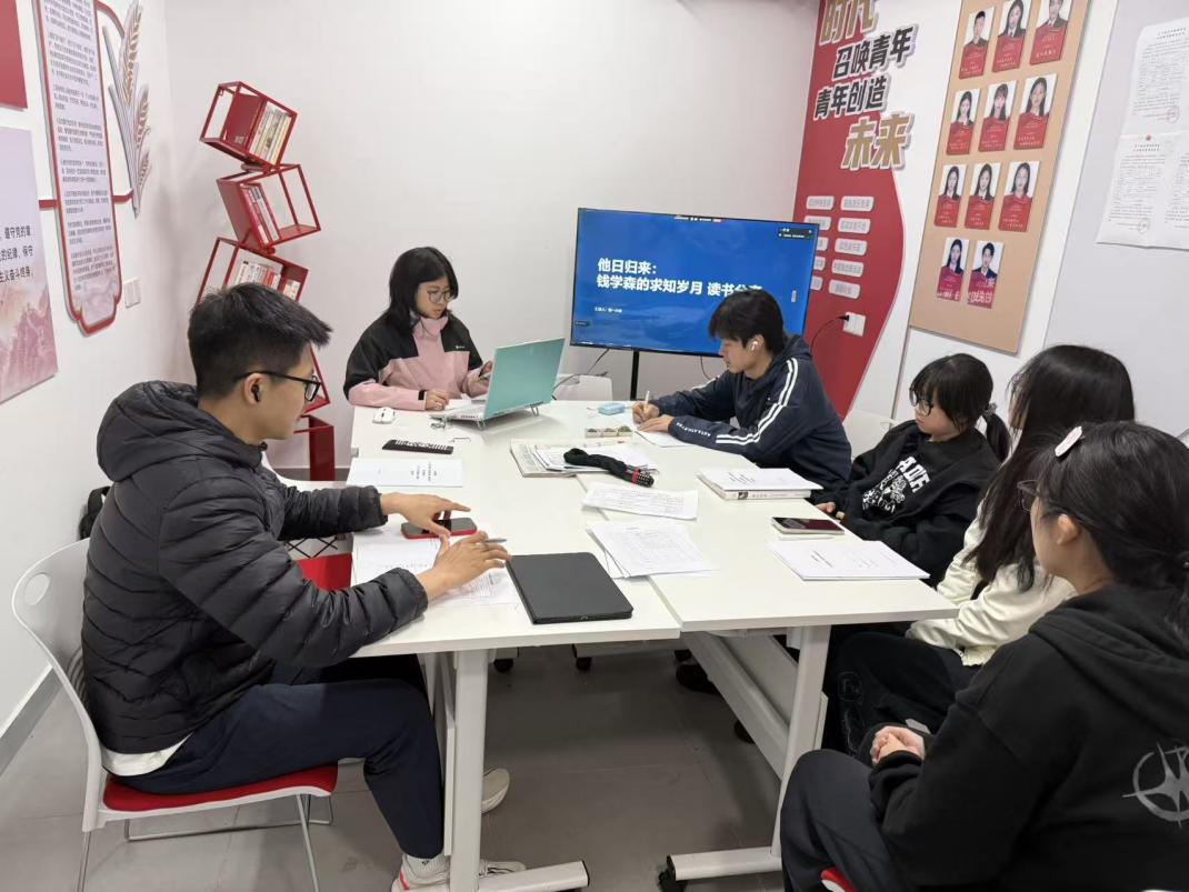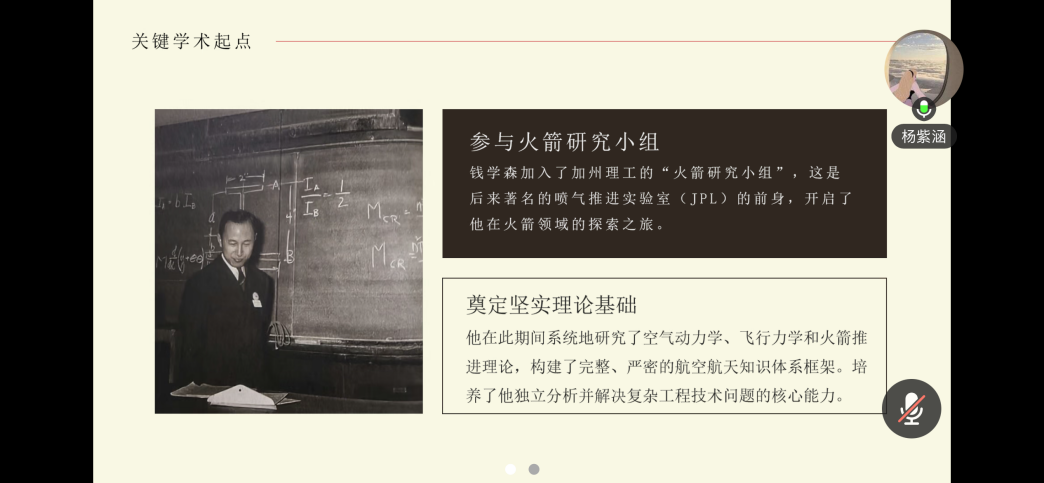 分享会上,杨紫涵、万朵带领全体学员,系统回顾钱学森先生从少年立志求学、远赴海外深造,到历经艰难阻挠、毅然归国投身国家建设的完整人生轨迹,将其人生选择与中国共产党领导下的民族独立、国家富强历程紧密结合,在党史时空坐标中解读科学家精神的时代内涵。两位主讲人重点介绍了钱学森在海外求学期间的关键学术经历:他系统钻研空气动力学、飞行力学、火箭推进理论等核心领域,构建起完整严密的航空航天知识体系,练就独立分析与解决复杂工程技术问题的过硬能力。作为早期核心成员,钱学森加入加州理工学院“火箭研究小组”——这正是后来世界著名喷气推进实验室(JPL)的前身,也正是在这里,他正式开启在火箭与航天领域的开创性探索,为后续归国投身祖国航天事业奠定了坚实学术基础与实践积累。从旧中国积贫积弱到新中国百废待兴,从党领导人民自力更生、发愤图强,到“两弹一星”精神载入党史,钱学森的人生历程,正是一代知识分子跟党走、听党话、报国为民的生动写照。