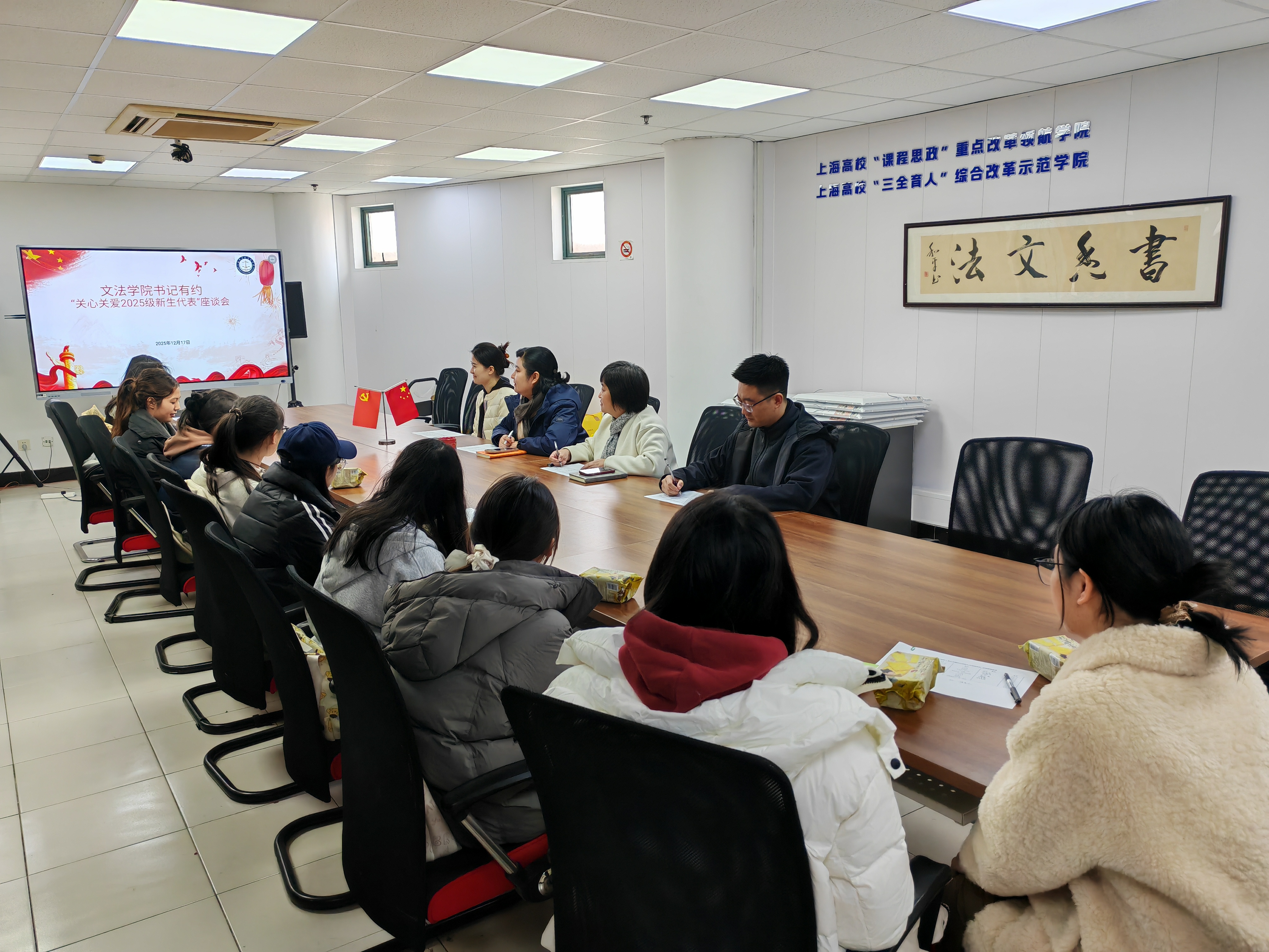 12月17日,文法学院“书记有约—关心关爱2025级新生代表”座谈会顺利召开。学院党总支书记朱永莉、党总支副书记林丽娜、资助专项负责人陆曼兮、辅导员董健鹏,与2025级新生代表共同出席本次座谈会,会议由林丽娜主持。